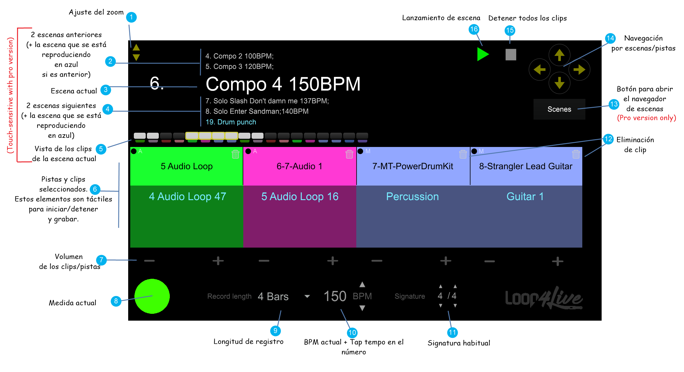 Utiliza una tableta con tu pedal Loop4Live para ver mejor tu lista de canciones. Muestra los nombres de las escenas y los clips en formato grande con muchos elementos interactivos, como inicio/fin de escena, inicio/fin/grabación de clip, cambios en la duración de la grabación, un navegador de escenas y mucho más.
