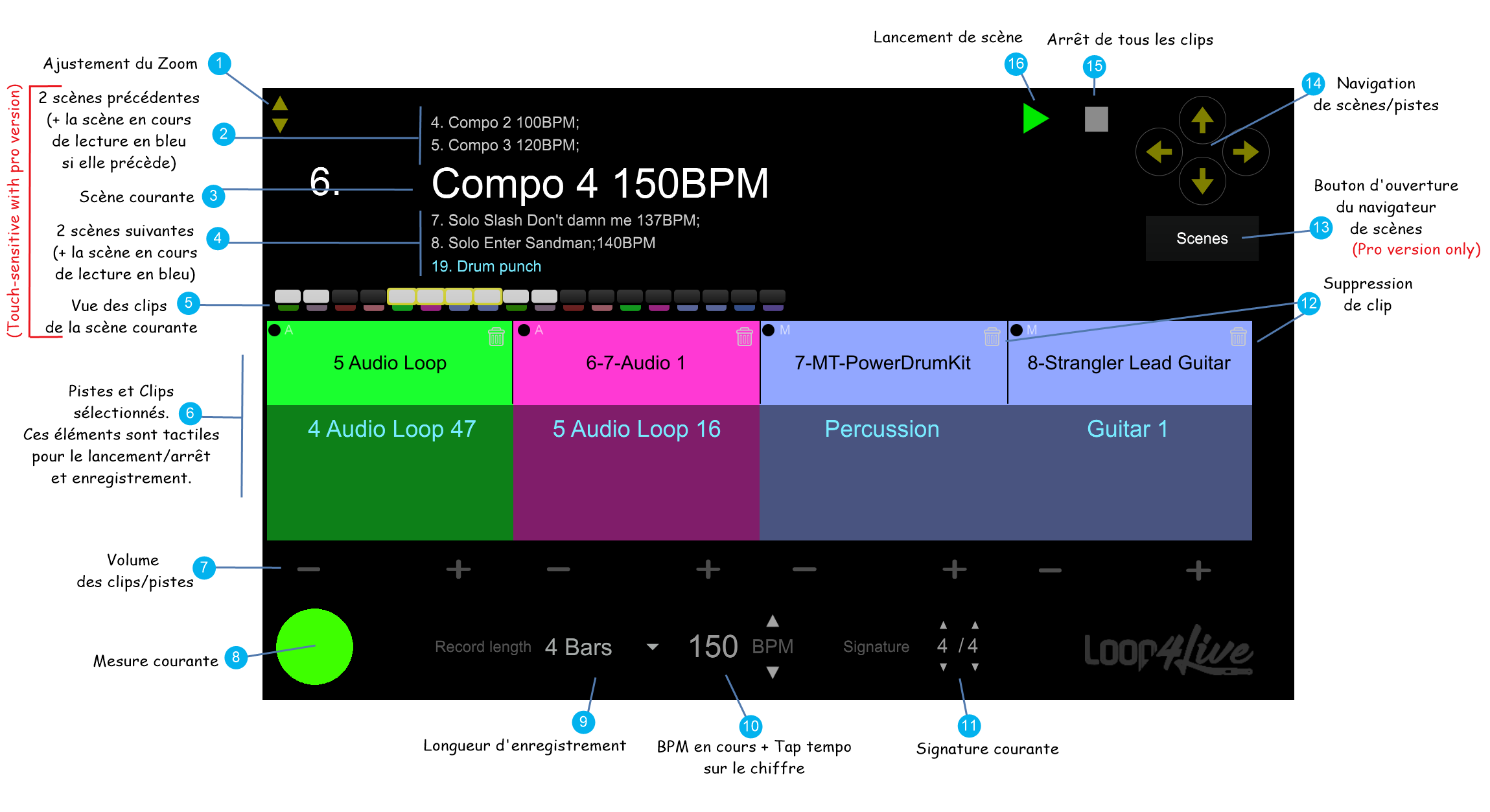 Utilisez une tablette avec votre pédale Loop4Live pour mieux visualiser votre setlist. Elle affiche les noms des scènes et des clips en grand format avec de nombreux éléments interactifs tels que le démarrage/l’arrêt des scènes, le démarrage/l’arrêt/l’enregistrement des clips, les modifications de la durée d’enregistrement, un navigateur de scènes, et bien plus encore !