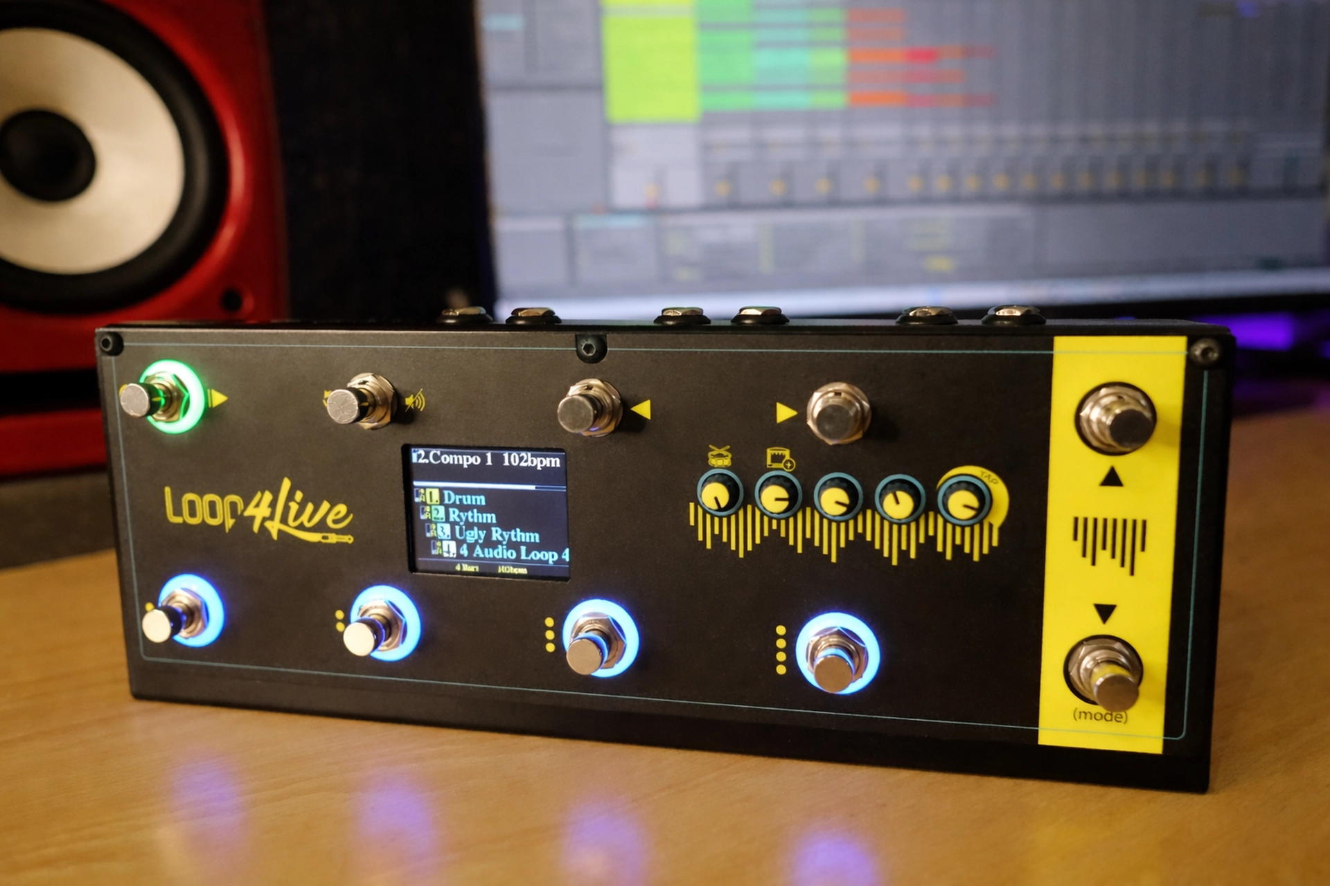 Loop4Live est un pédalier midi dédié à Ableton Live qui offre une nouvelle manière de piloter votre ordinateur. Loop4Live transforme votre PC/Mac en une station looper, sans besoin d’accéder à un moniteur (ou une souris) : Toutes les principales fonctionnalités sont disponibles sur Loop4Live grâce à un grand écran, des anneaux de leds, 10 footswitches et 5 encodeurs rotatifs.